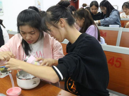随后,在志愿者们的指导下,同学们分组制作冰皮月饼。揉面团、包馅、模具成型……大家迫不及待地动起手来,一擀、一推、一揉、一包、一压,一个个美味精致的月饼随之诞生。