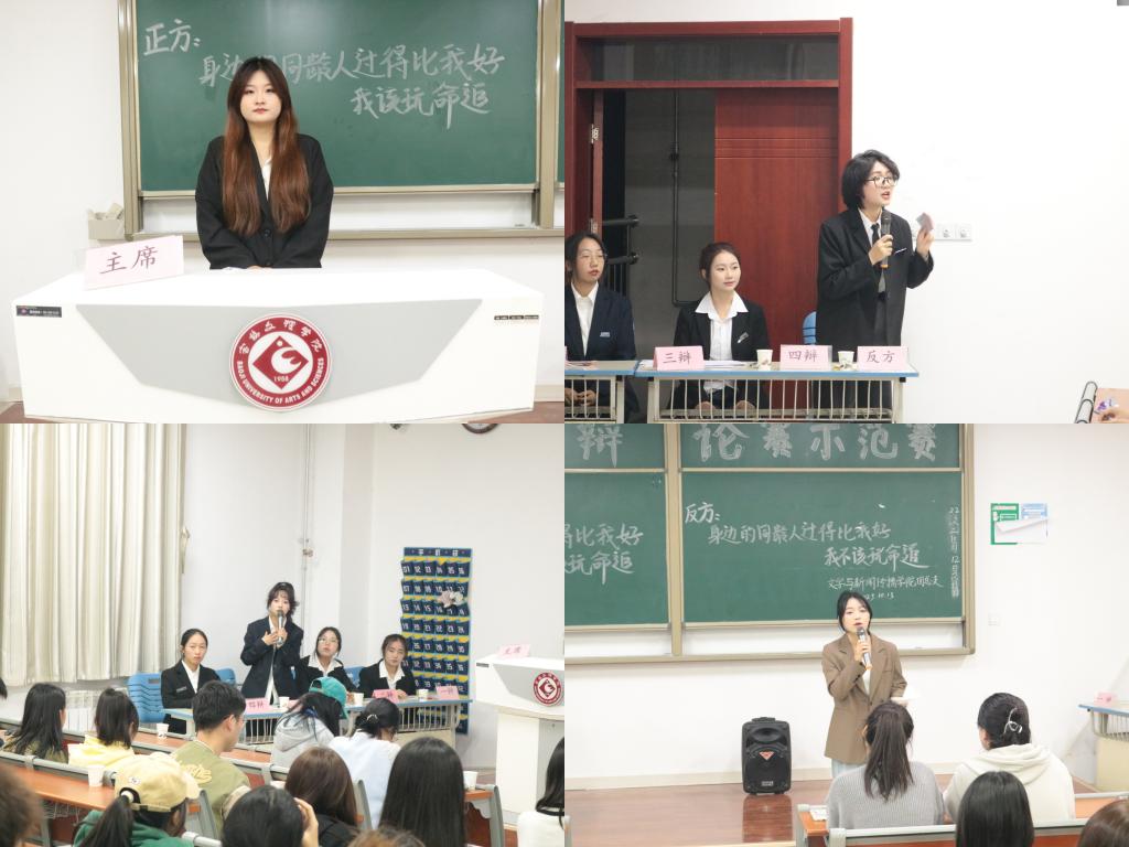 赛场上,由院辩论队组建的正反双方辩手就“身边的同学过得比我好,我是否该玩命追”的辩题展开了精彩辩论。双方辩手铿锵有力地阐述了各自观点,剖析辩题,逻辑缜密,思路开阔。队友间默契配合、旁征博引、严谨阐述,论证充分有力,语言准确凝练。他们严密的思维、犀利的语言给在场的观众留下了深刻印象,其出色的表现赢得了现场的阵阵掌声。