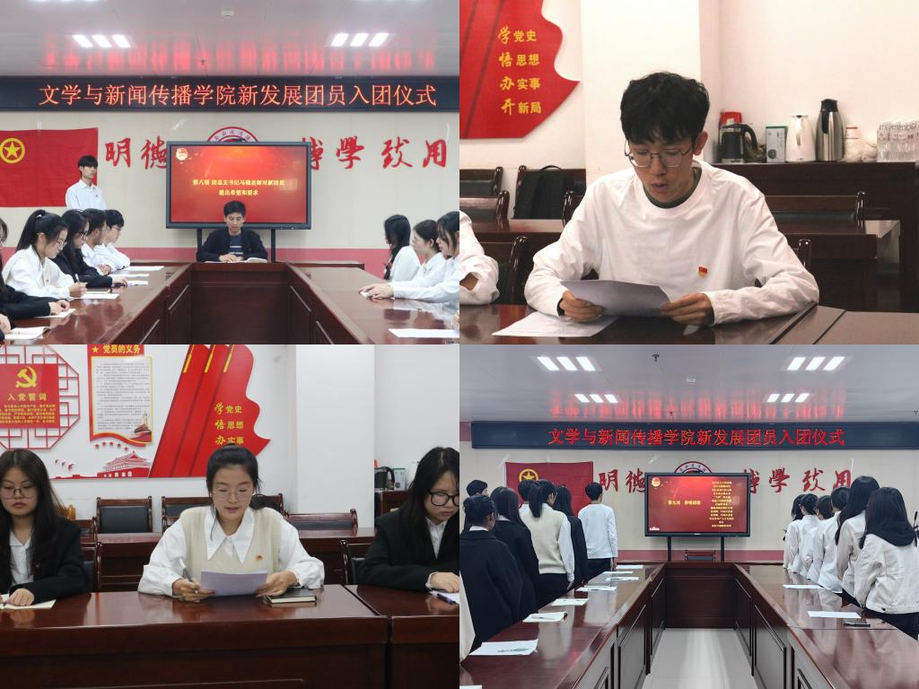伴随着激昂的国歌演奏,入团仪式正式开始。石嘉豪说明了举办入团仪式的意义,并宣读了2023年新发展团员名单,马晓为新发展团员颁发并佩戴团徽。接着,全体与会人员在石嘉豪的带领下完成了庄严的入团宣誓。随后,入团介绍人代表2021级广播电视编导专业员工刘权莹宣读了《团章》中有关团员的义务和权利条款,明确了共青团员的义务和权利。2021级汉语言文学专业员工黄靖雯和王思怡分别作为新团员代表和老团员代表发言。