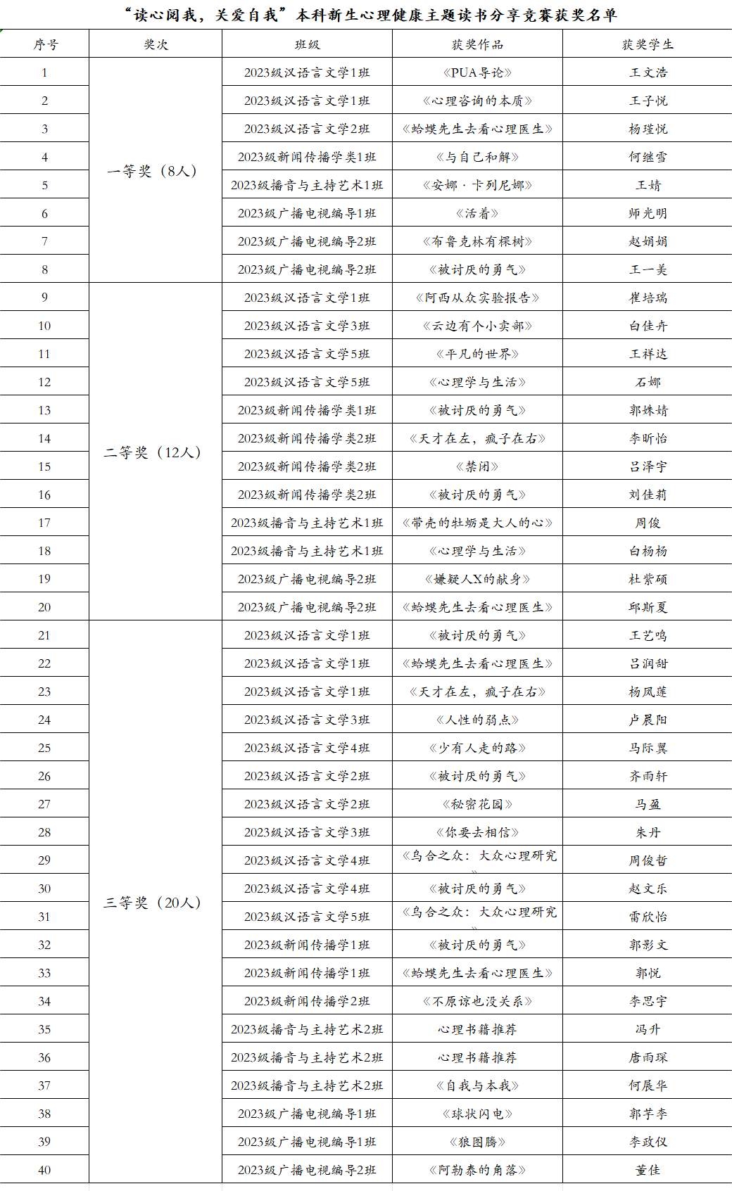 经评选,公司2023级汉语言文学1班王文浩等8名同学荣获一等奖,2023级新闻传播学类1班郭姝婧等12名同学荣获二等奖,2023级播音与主持艺术2班冯升等20名同学荣获三等奖。