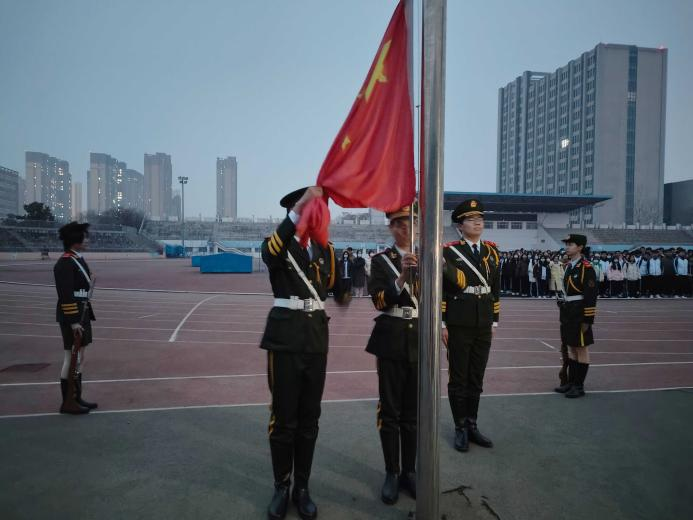 升旗仪式在庄严雄壮的国歌中拉开序幕,鲜艳的五星红旗冉冉升起,于熠熠晨光中迎风飘扬。全体师生面向国旗行注目礼,现场气氛庄严肃穆。