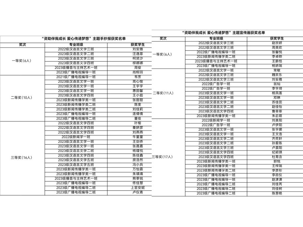 本次活动共上交89份参赛作品,经评选,公司2022级汉语言文学3班赵欣妍等6名同学荣获宣传画比赛一等奖,2022级汉语言文学1班常敏等11名同学荣获二等奖,2022级新闻学1班刘美阳等17名同学荣获三等奖;2022级汉语言文学3班刘安雅等6名同学荣获手抄报比赛一等奖,2021级广播电视编导1班韦芳等10名同学荣获二等奖,2022级汉语言文学4班叶榆等16名同学荣获三等奖。
