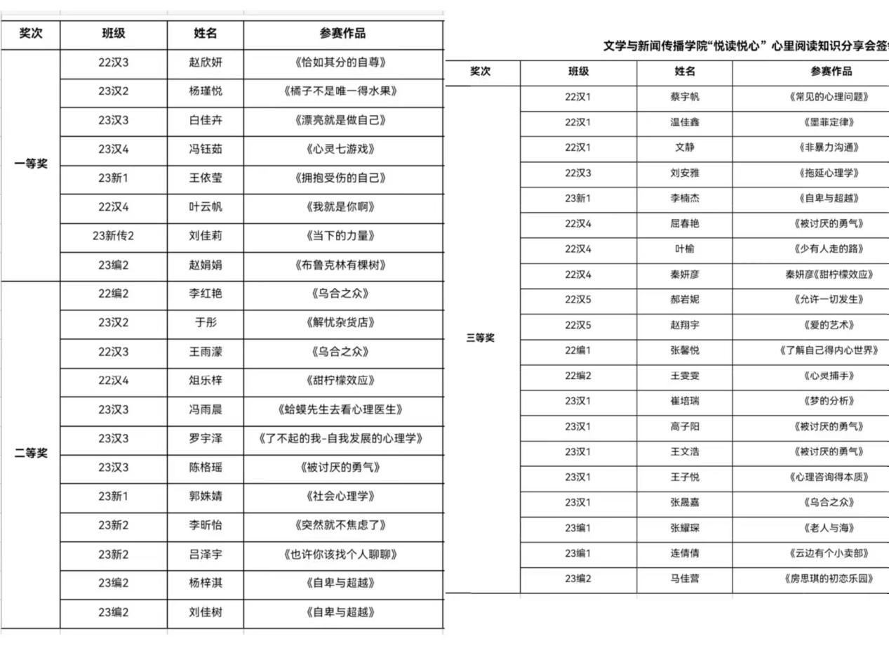 经评选,公司2023级汉语言三班赵欣妍等8名同学荣获一等奖,2022级广播电视编导二班李红艳等12名同学荣获二等奖,2022级汉语言文学一班蔡宇帆等20名同学荣获三等奖。