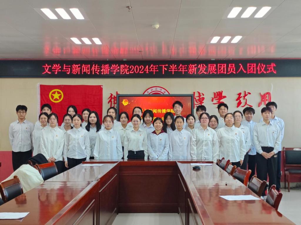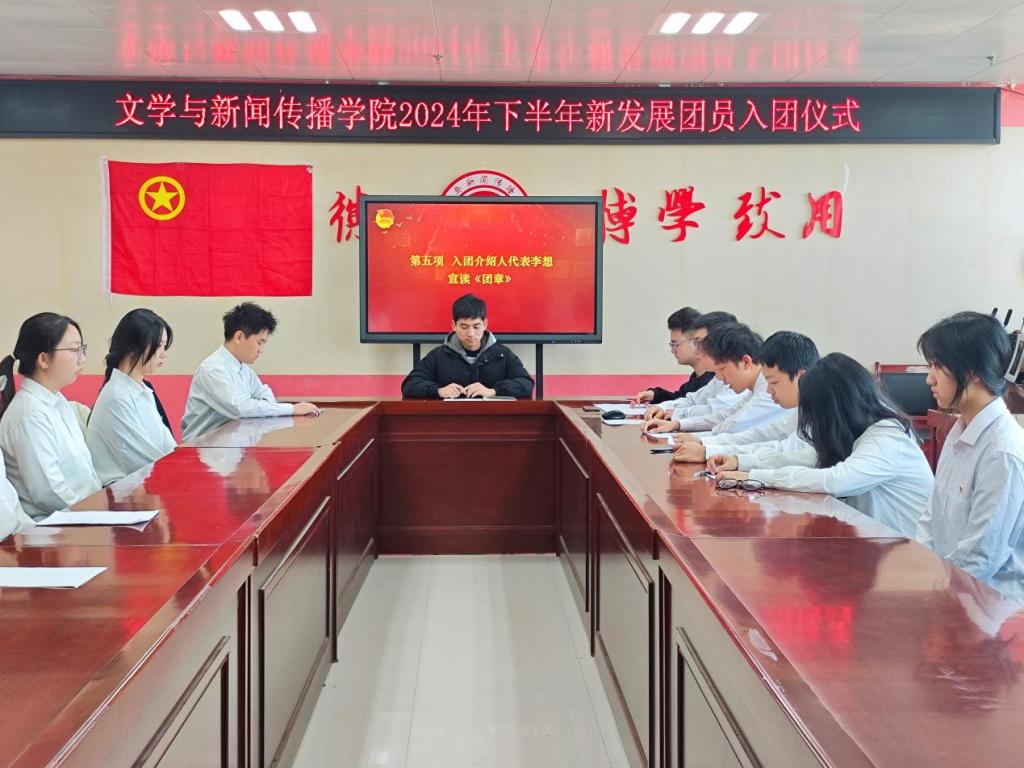 仪式在庄严的国歌声中拉开序幕。苟宇轩宣读2024年下半年新发展团员名单,公司团委书记马晓为新团员颁发并佩戴团徽。随后,与会人员在苟宇轩的带领下完成了庄严的入团宣誓。入团介绍人代表2023级播音与主持专业员工李想宣读《团章》中有关团员的义务和权利的条款。2022级播音与主持艺术专业员工郝钰蛟、2023级汉语言文学专业员工张晟嘉分别作为新老团员代表发言。