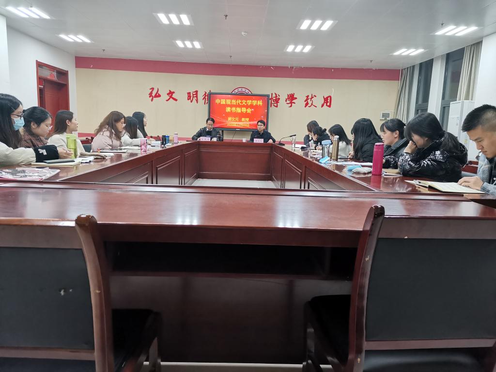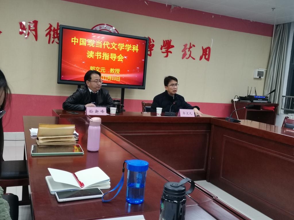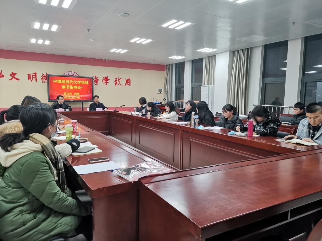 2020年11月23日晚,为检阅入学以来研究生读专业书情况,公司中国现当代文学学科在博文楼1401会议室举办第一次“中国现当代文学学科读书指导会”。中国现当代文学学科带头人郭文元教授率先做了读书、研究等学业方法指导。会议由副经理孙新峰主持。全院2019级、2020级所有在读的现当代文学学科学术硕士研究生参加了会议。