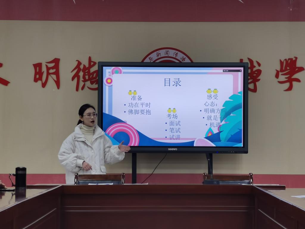 2019级专硕李梦、殷晓、王丽静、母丹、朱虹陪、高杰杰、曹海燕、韩宣、杜楚玉等10名同学分别围绕择业、应聘、学习、实习心得等方面做了经验分享。其中李梦和殷晓选择了自主实习,已经分别和天津南开区、温州市中学签约。她们专门为会议制作了精美的PPT,用现场网络连线的方式,给2020级讲述了自己辗转找工作、参加公司招考的酸甜苦辣。赵蜀欣已经和绵阳市某高中签约,她制作了精美有效的个人简介,告诉学妹们要准确定位自己,要有一定的社会适应能力,不要怕名校员工,要敢于挑战,扬长避短;母丹和朱虹陪已经考取了成都市核心区公司编制教师,她们告诉2020级,找工作要胆大心细,注意展示个人才艺。韩宣在长岭中学实习,她给2020级分享了自己代班主任的体会,告诉学妹们,官办公司也面临一系列改革和发展问题。王丽静、高杰杰、杜楚玉、曹海燕等也将自己在实习过程中的感受和心得,以及在招聘会上找工作过程中积累的经验倾囊相授。