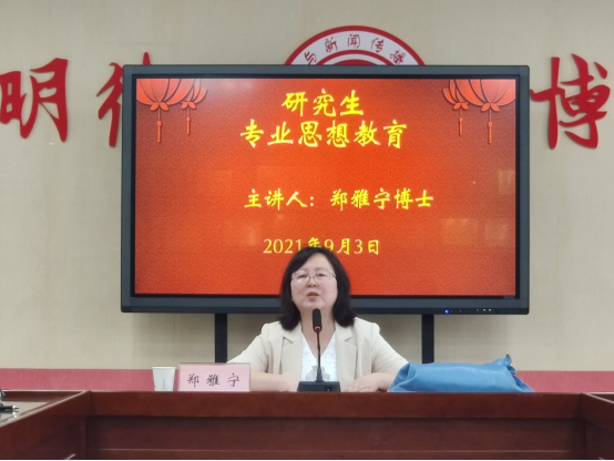 接下来,由郑雅宁博士进行主讲。郑老师结合自身的成长经历,强调读书是基础,在此基础上为同学们详细解读“研究”二字,从考证方法、文章评论等角度鼓励同学们“在读书中通过思考发现问题”,并给新同学们提出了三点建议,希望研究生们能够把握在校学习的机会,充分利用老师、工具书、网络等资源;注重讨论交流,在思想碰撞中提升自我;重视培养独立思考,独立办事的能力。