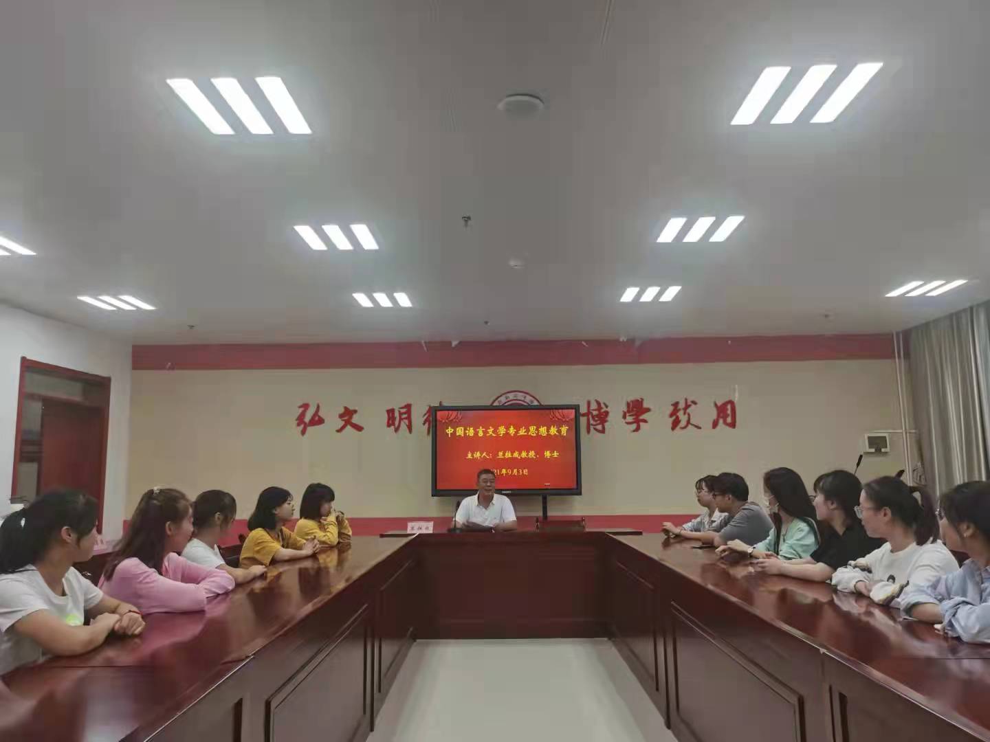 下午14:30,公司分为三个不同的主要方向开展专业思想教育,一是汉语言文学学科,由学科带头人兰拉成教授主讲。二是语文教育学科,由学科带头人王渭清副教授主讲。三是广播电视学科,由学科带头人孟改正教授主讲。三位主讲老师有针对性的从学科发展与团队力量、专业行业发展趋势与就业前景、专业学习要求与建议等方面对同学们的专业学习进行深入的指导。