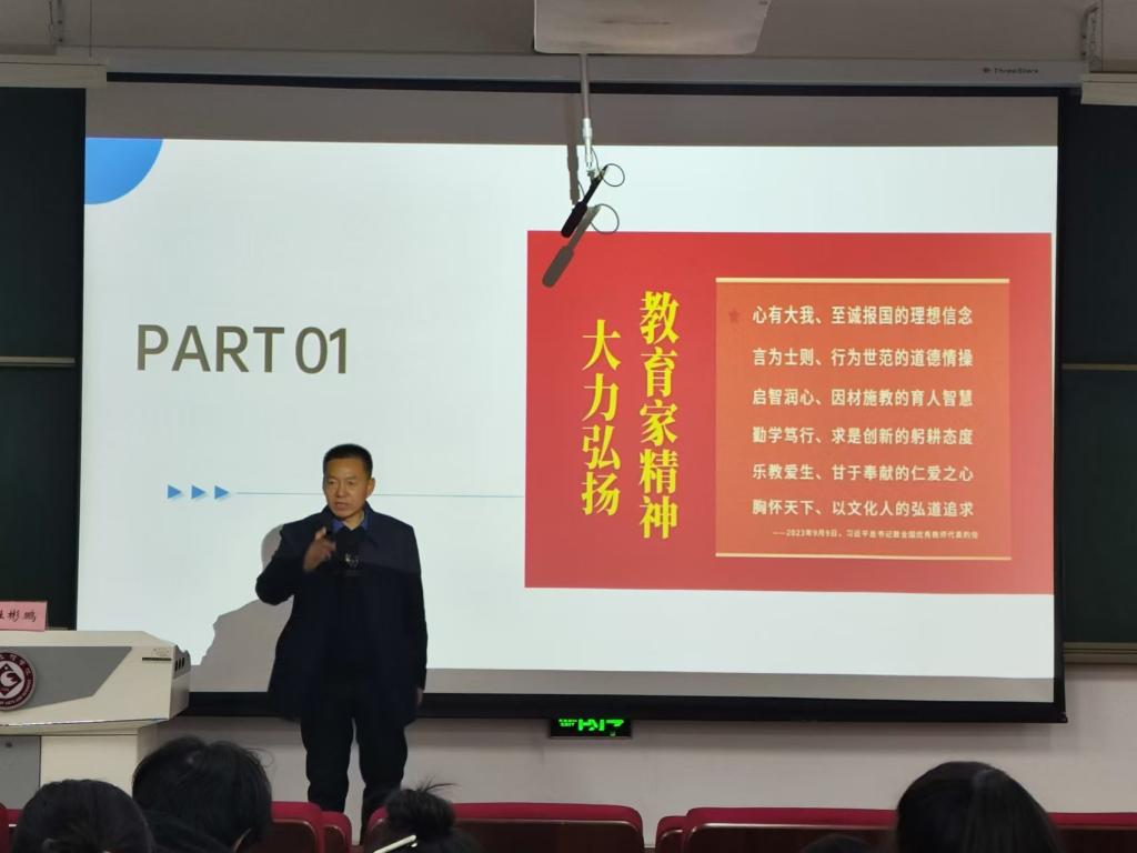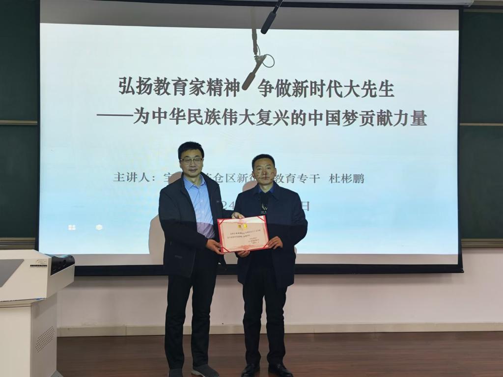 12月12日下午,公司2005届汉语言文学专业员工、陈仓区新街镇教育党总支书记、教育专干、驻村第一书记兼工作队队长杜彬鹏,应邀为伟德国际victor1946优师专项班、公费师范生班作题为“弘扬教育家精神,争做时代大先生”的主题报告。经理孟改正教授主持报告会并为杜彬鹏颁发实践教师聘书,中文系主任李剑清教授、优师专项及公费师范生等100余人参加报告会。