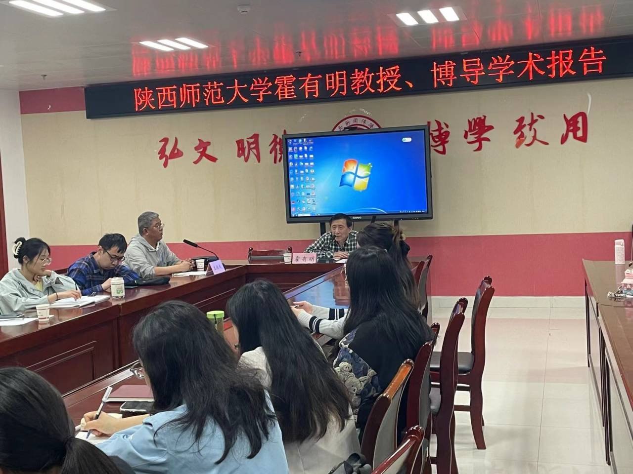 接着,霍有明教授开始题为《唐初诗歌的承传与演进——兼论初唐诗人杨师道》的学术报告。霍有明教授根据唐初审美风尚的变化和文艺发展的渐变现象,结合唐初诗人杨师道的作品,对唐初诗风作出评价。梁、陈之际的宫体诗反映了当时统治阶级荒淫无耻的宫廷生活,诗风轻艳浮华。唐初,随着诗人们社会生活基础的巨大变化,也产生了新的审美风尚。李世民吸取前朝教训,采取开明的统治政策。其诗歌无一是宫体诗,相反倒有许多刚健清新之作。霍有明教授以李世民《经破薛举战地》和《过旧宅》这两首诗歌为例,说明了李世民诗歌具有豪放的特点。唐初出现了《秦王破阵乐》这样的镗鞳之音和《破阵舞》这样的威武之蹈,诗歌创作方面也产生出不少格调很高的军旅、边塞作品。霍有明教授列举魏徵《述怀》、窦威《出塞曲》、虞世南《出塞》等诗歌向老师和同学们说明了唐初诗歌风格的变化。唐初也不乏君臣宴游、奉和赠答以及描写宫廷生活的诗作,言语虽华丽,但并不过分雕琢而且言归雅正,不能算作宫体诗,只能算作宫廷诗。霍有明教授特意说明宫体诗与宫廷诗的不同,提醒同学们注意辨别。霍有明教授总结唐初诗风的变化,阐明了唐初诗风的转变不是一蹴而就,是一个渐变的过程,并且这个过程是不能忽视的。