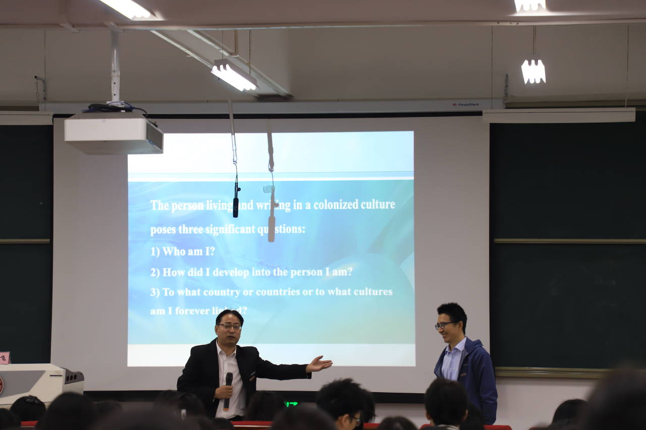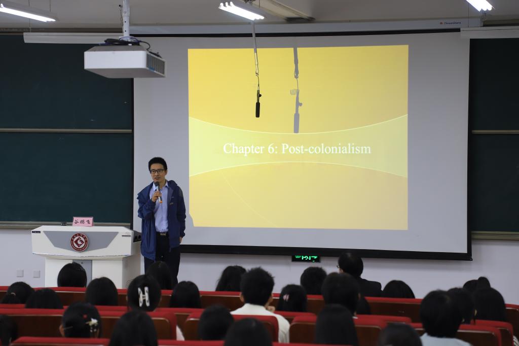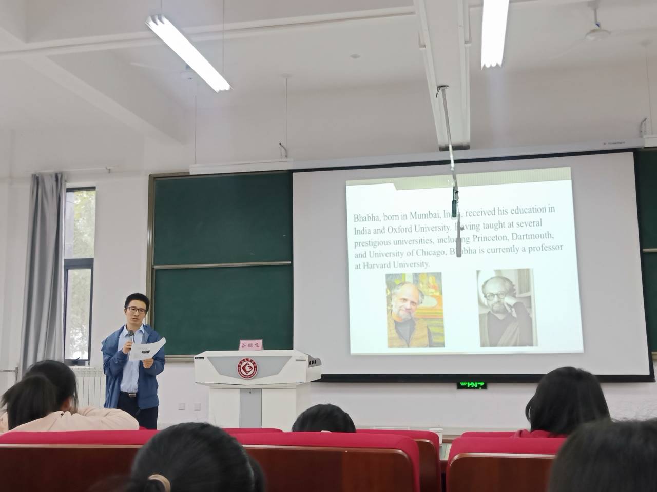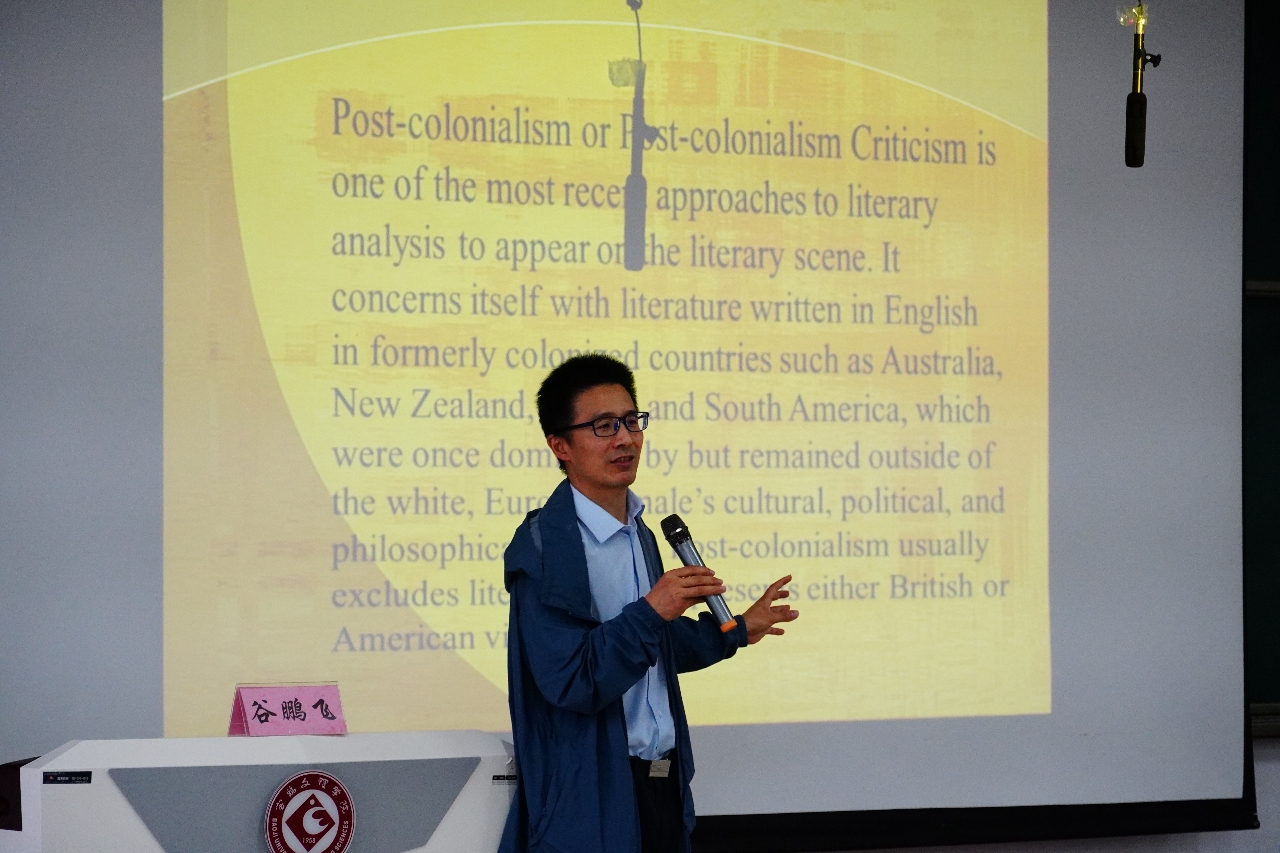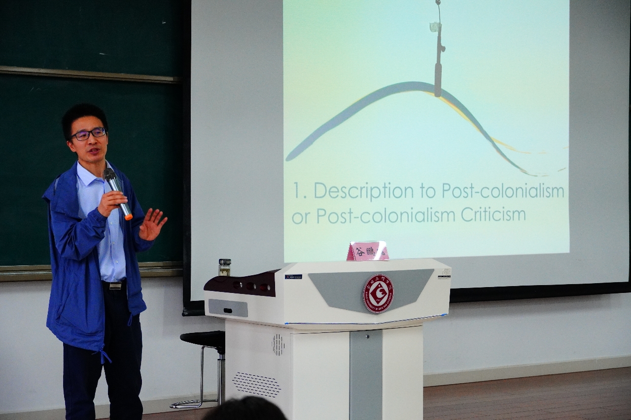 其次,谷鹏飞教授重点讲述了关于后殖民主义的相关内容。谷鹏飞教授围绕“后殖民主义的理论、目的、主张和代表人物”四个方面展开详细讲解。他提到了后殖民主义的四个基本观点,并以此为出发点鼓励大家走出去,拓宽自己的国际视野,不要局限于当下。谷鹏飞教授指出特定时代的特征总会反映在该时期的作家身上。他列举了后殖民主义的代表人物,说明了他们彼此之间的观点并不统一,可能存在互相打架的现象。谷鹏飞教授重点介绍了爱德华·沃第尔·萨义德(Edard Wadie Said)和他的著作《东方主义》《文化与帝国主义》,并强调大家应当重视自我与他者的关系。自我代表主体意识,他者是被统治、被征服、被规训者。怎样提升自我,如何自己做主这个问题可能会伴随我们终生。在介绍霍米•巴巴(Homi K. Bhabha)和他的作品时,谷鹏飞教授提到了文化定位、被殖民者的认同困境、双重意识等现象,并以“香蕉人”为例,进行了生动形象地解读。