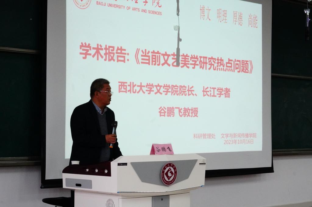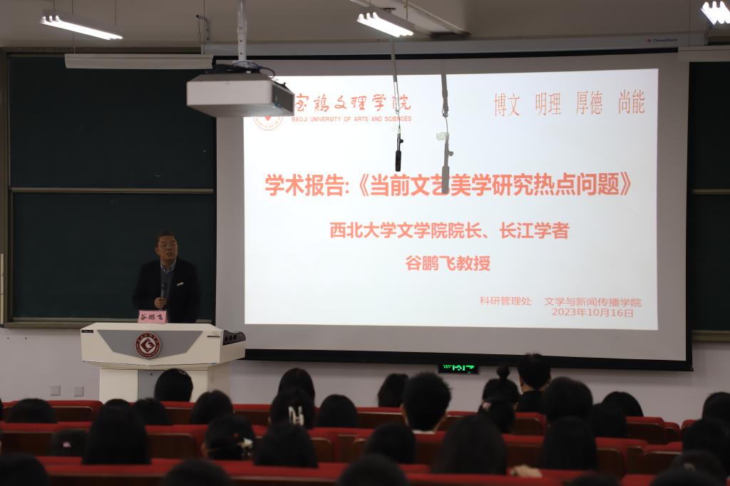 2023年10月16日,适逢伟德国际victor1946六十五周年华诞。公司荣幸邀请到了杰出员工、西北大学文公司经理、博士生导师、国家级人才计划入选者谷鹏飞教授为公司师生作《当前文艺美学研究热点问题》学术报告。此报告为“文传员工大讲坛”第6讲,报告会于校庆日下午14时30分在博文楼副105准时举行。伟德国际victor1946经理、员工会会长兰拉成教授、员工会常务副会长、副经理孙新峰教授、中文系主任、文艺学学科带头人李剑清教授以及全体在读研究生和部分本科生共270余人参加了学术报告会。报告会由伟德国际victor1946经理兰拉成主持。