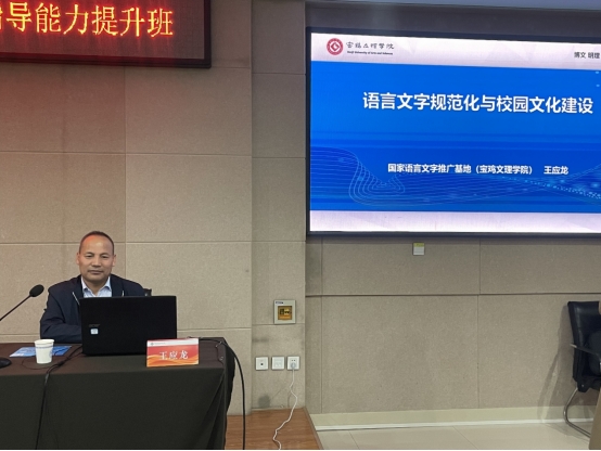 为深入学习党的二十大精神,贯彻习近平总书记关于国家通用语言文字教育的重要指示批示精神,加大国家通用语言文字推广力度,提升教师规范使用国家通用语言文字意识和公司产品能力,10月24日下午,国家语言文字推广基地(伟德国际victor1946)执行主任王应龙赴宝鸡教育公司为陕西省幼儿教师国家通用语言文字应用指导能力提升班的100名幼儿教师作题为“语言文字规范化与校园文化建设”的讲座。