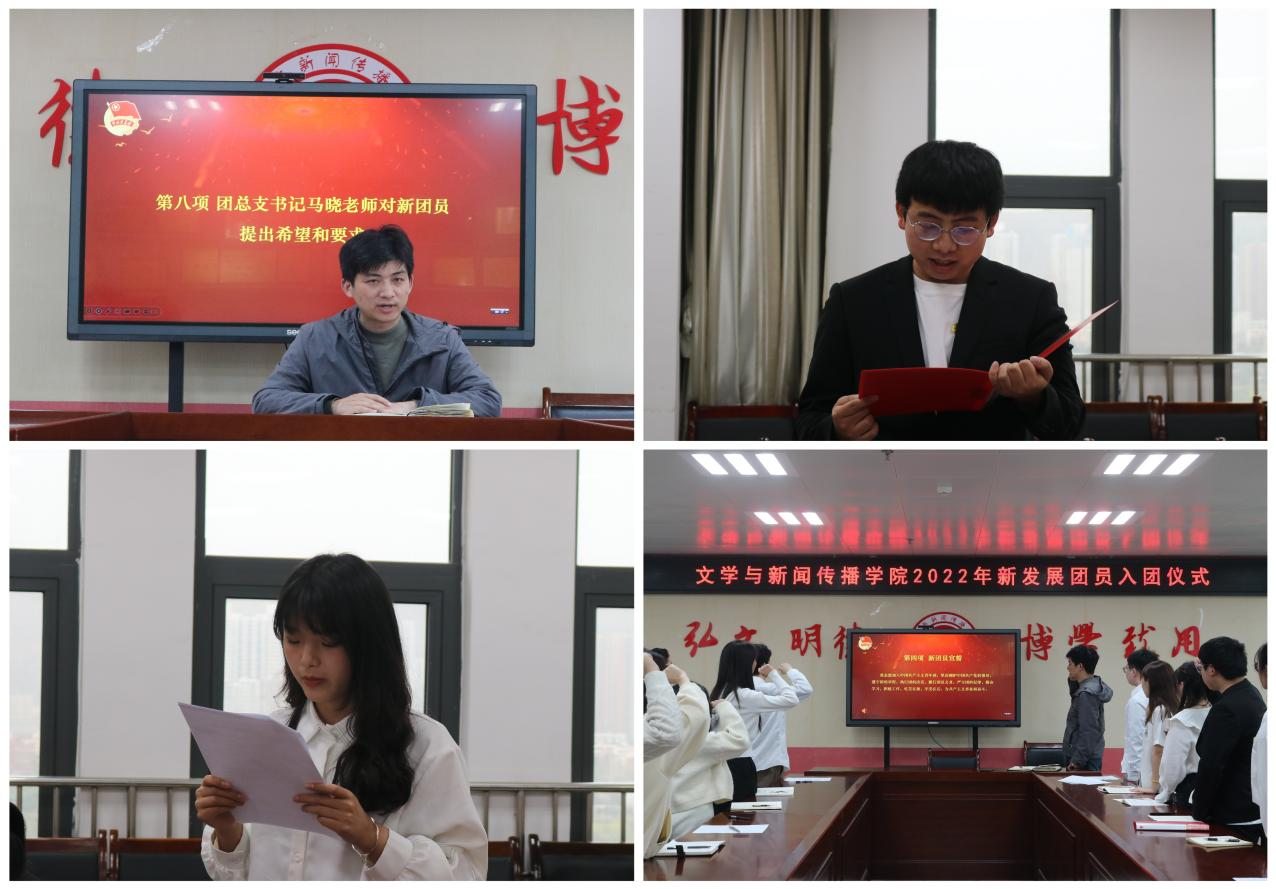 伴随着激昂的国歌奏唱,入团仪式正式开始。刘涛说明举行入团仪式的意义,并宣读了2022年新发展团员名单,马晓为新发展团员颁发团员证并佩戴团徽。接着,全体与会人员在马晓的带领下完成了庄严的入团宣誓。随后,入团介绍人代表2021级汉语言文学3班宣传委员马森宣读了《团章》中有关团员的义务和权利的条款,明确了共青团员的权利和义务。陈柏汀同学和任凯同学分别作为老团员代表和新团员代表发言,表示要时刻按照团员的标准严格要求自己,勤奋学习,积极工作,努力成长为堪当民族复兴重任的时代新人。