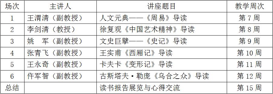 下周一(4月8日)晚7点半进行本学期“经典导读系列讲座”第1讲(本学期共6讲,具体安排见下表),由王渭清副教授主讲人文元典——《周易》导读,望各班组织同学按时参加。本学期的讲座采用线下形式,地点固定在博文楼副楼305教室。每期海报及阅读著作电子版会提前发到员工干部群,请各班看到通知后及时转发给同学们。