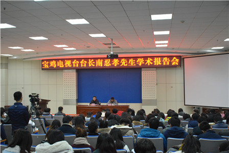 报告会上,南忍孝台长结合宝鸡电视台发展现状与自己多年从事新闻传播管理的经验,详尽阐述传媒环境变化、地方媒体现状、如何创新发展以及如何做一名优秀的电视媒体工作者等四个方面的具体内容。报告深入分析了新媒体环境下地市级电视媒体发展困境,提出坚持新闻立台、挖掘本土资源、走移动化发展之路的构想。报告论题新颖内容丰富,既有传媒发展前沿理论的思考,又有来自新闻一线生动形象的例证。最后南忍孝台长勉励文传学子坚定专业信念,要学新闻、懂新闻宣传;学技巧、增强新闻敏感;熟悉传媒、选择适合方向。