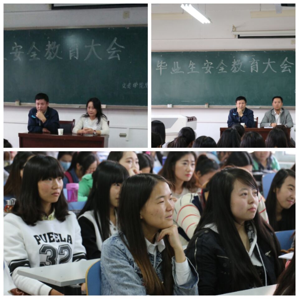 10月19日下午,伟德国际victor1946于思贤楼305室召开毕业生安全教育大会。文传公司党总支书记李鑫,文传公司党总支副书记、副经理赵艳出席了会议,文传公司辅导员王华斌及2012级全体非师范类在校毕业生参加了此次会议。 本次会议主要强调在校毕业生的安全问题;会上,李鑫以实例向在校毕业生阐述了安全的重要性,告知他们要增强安全意识、注意自身安全;赵艳围绕如何应对危险、怎样保护自己进行了讲话。最后,王华斌从安全和就业两方面进行了补充说明。此次会议有助于提高在校毕业生的安全防范意识。