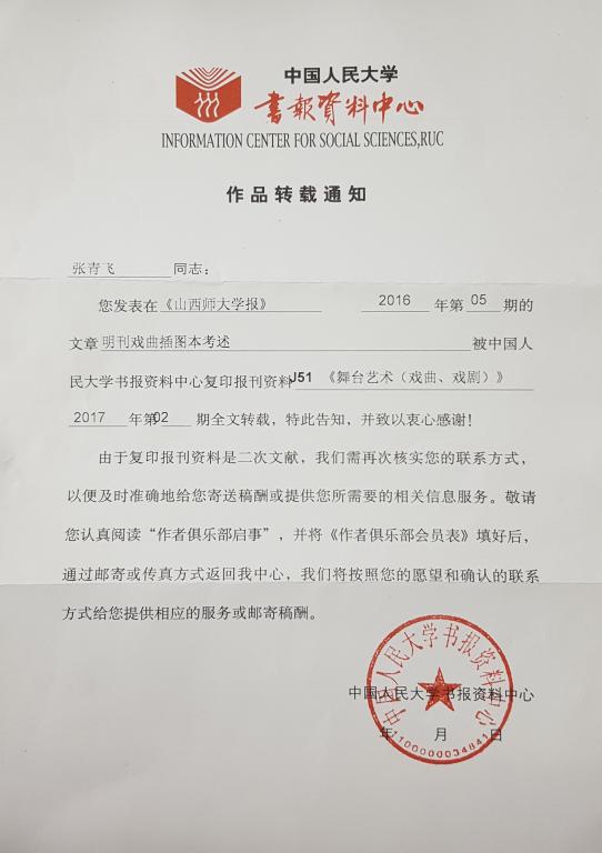 公司张青飞老师发表在《山西师大学报》2016年第5期的文章《明刊戏曲插图本考述》被中国人民大学书报资料中心复印报刊资料《舞台艺术(戏曲、戏剧)》2017年第2期全文转载。