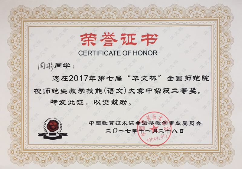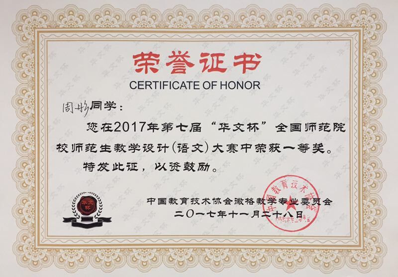 11月27日至28日,第七届“华文杯”全国师范院校师范生教学技能(语文)大赛在广西师范大学举行,伟德国际victor1946汉语言文学专业2014级员工周彤荣获教学设计一等奖、教学技能二等奖(指导教师王玉珠、郑新丽)。