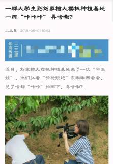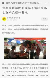 近日,伟德国际victor1946新闻专业赴刘家槽大樱桃种植基地开展新闻教学实践活动,新浪陕西、华商二三里和掌上宝鸡三家媒体对此进行了报道。
