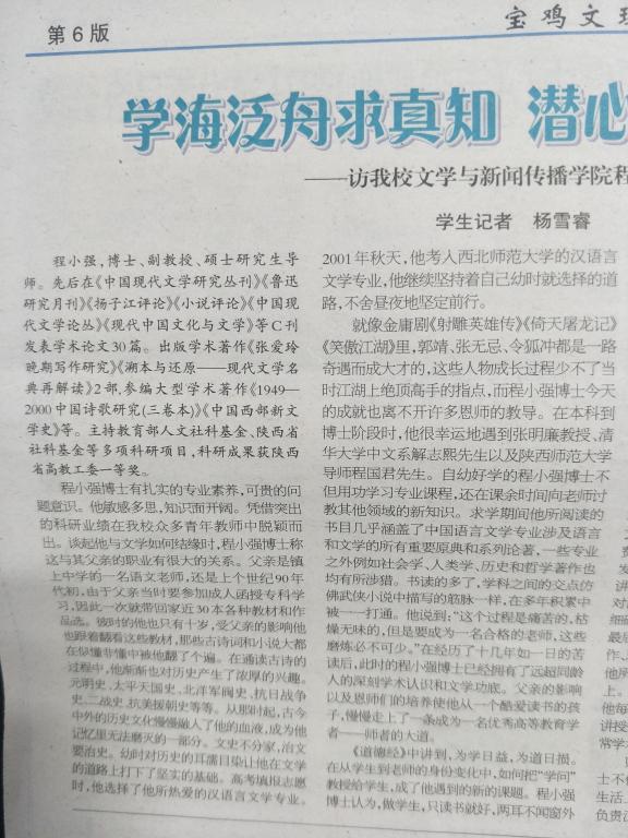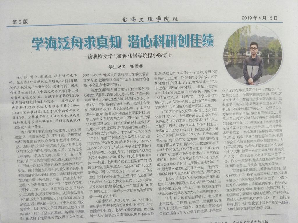 在采访时笔者发现程小强老师是没有双休日的,对于这一点他解释说自己普遍的工作状态就是5+2,白加黑。程小强老师在学术上严格要求自己。他敬畏学术,绝不粗制滥造。发表的C刊论文均万字以上,最长的《现代中国文化与文学》刊物发表了1.7万字。几乎全为稿费发表。他告诉笔者,这两年时间,中国的高等教育发生了很大的变化,精细化和大数据化影响下讲求细作和规范,工作任务当然比以前重,如果对自己不严加要求便会与时代脱轨。日常稍显细碎的工作确实会影响读书思考时间,尤其到最后会压缩休息时间,但尽管如此他依然尽量还是在工作、思考著文和休息之间寻求平衡。于他而言,他所倾向于将更多的时间花在读书思考著文上。他认为:个人独立思考对教学很有助益。他每年讲授《中国现代主义诗歌研究》课程,但讲授效果及反响一年优于一年,原因就在于日常学术研究对其思考方式与文本理解的变化。