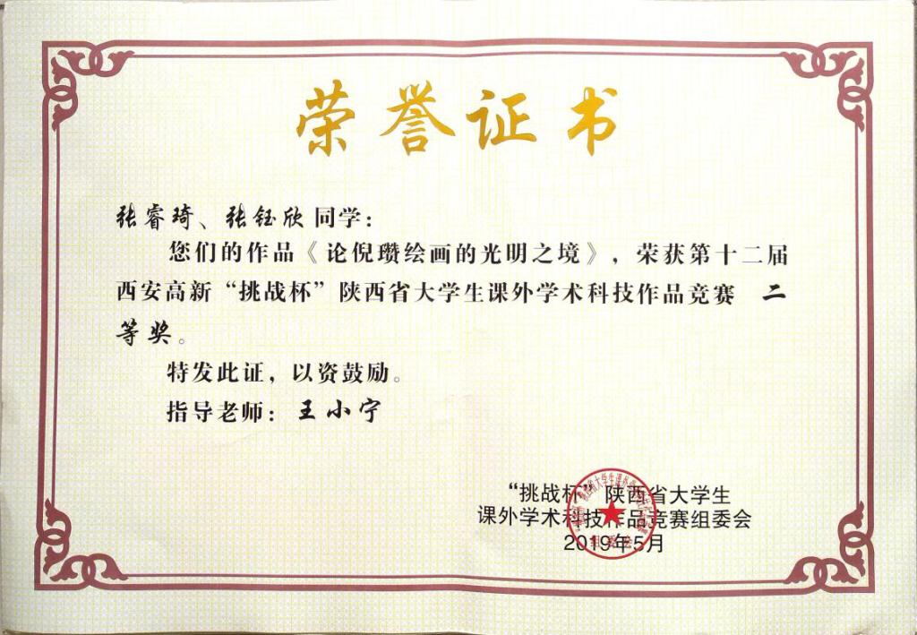 第十二届西安高新“挑战杯”陕西省老员工课外学术科技作品竞赛近日在西北工业大学降下帷幕,我院教师王小宁博士指导,2017级汉语言文学4班员工张睿琦负责的《论倪瓒绘画的光明之境》在哲学社会科学类社会调查报告和学术论文决赛中荣获二等奖。本次大赛全省有45所高校参与,共申报700余项作品,277项作品入围终审决赛。这是近六年公司在挑战杯省级比赛获得的最好成绩。