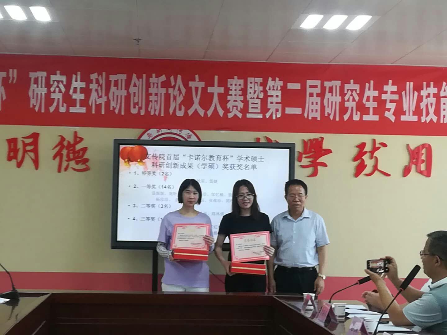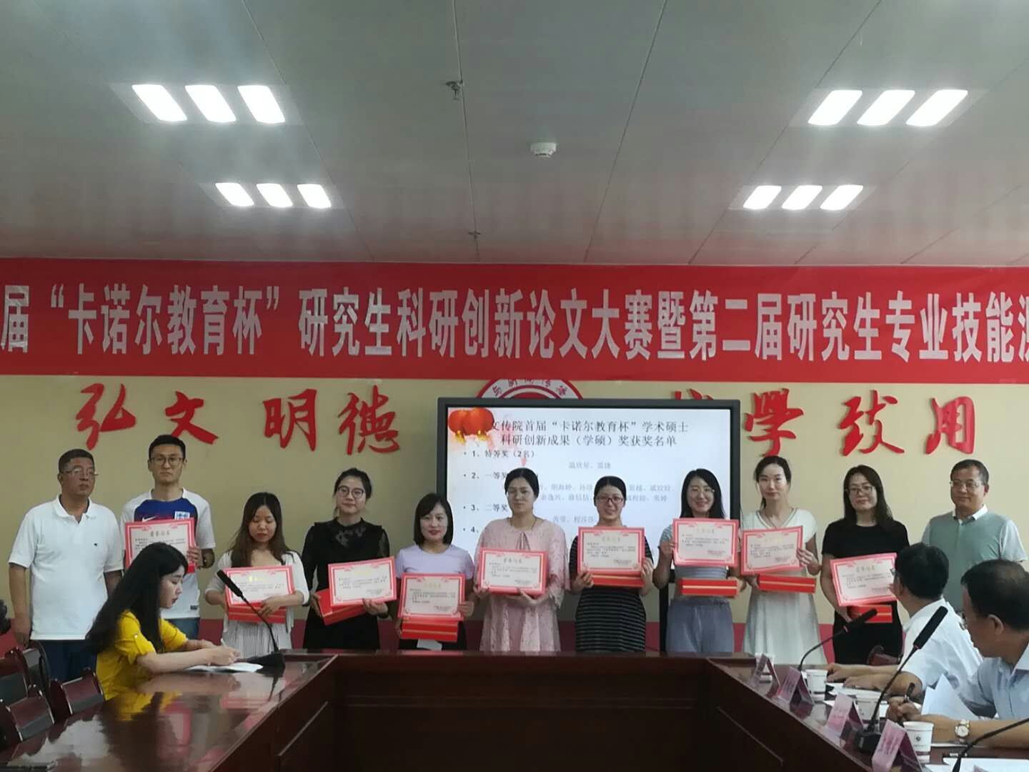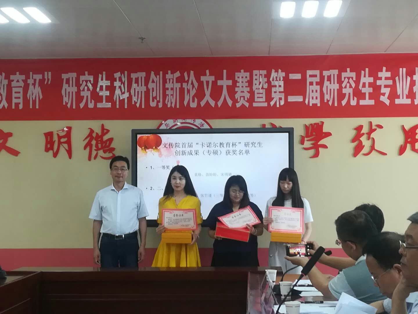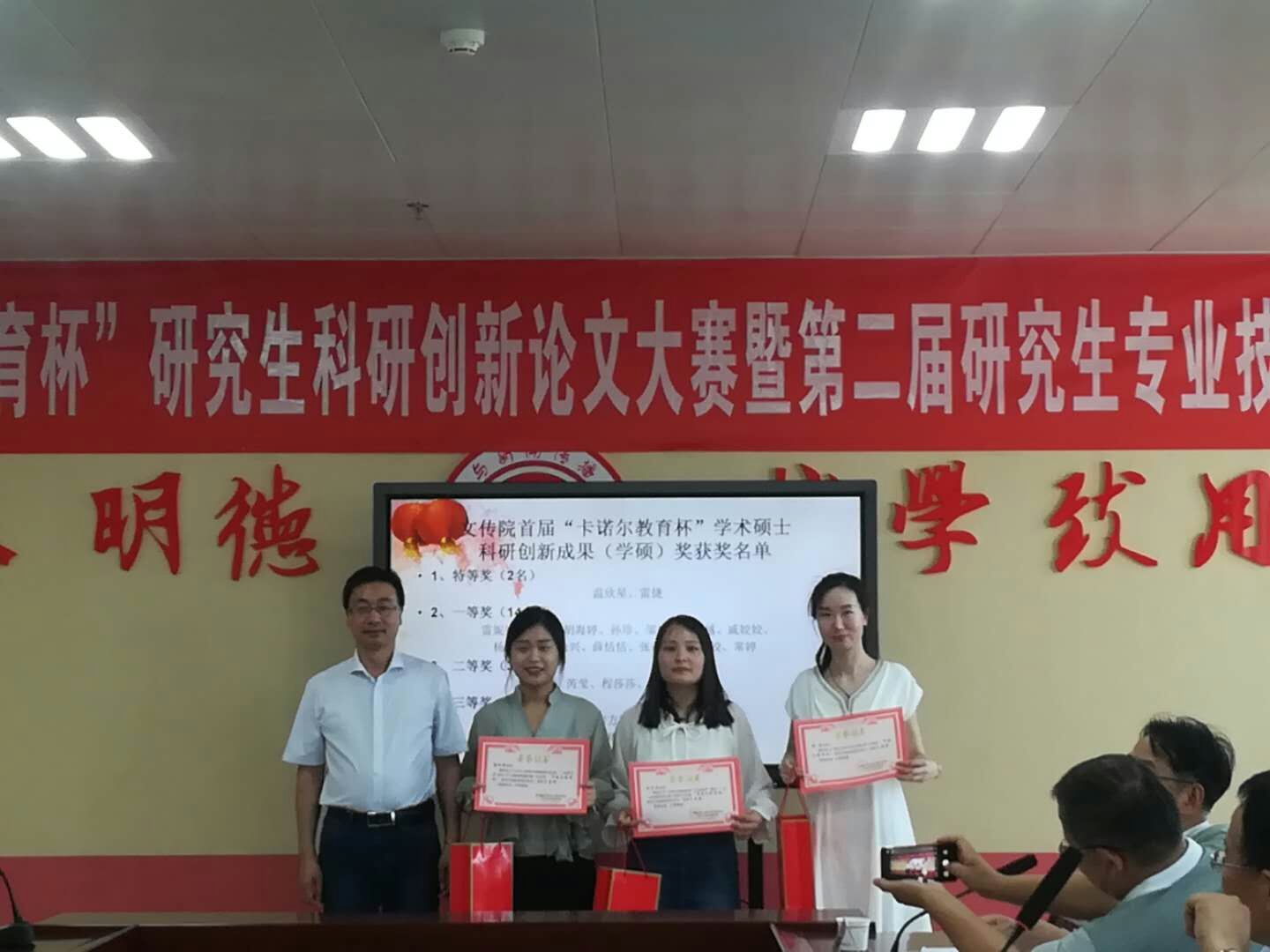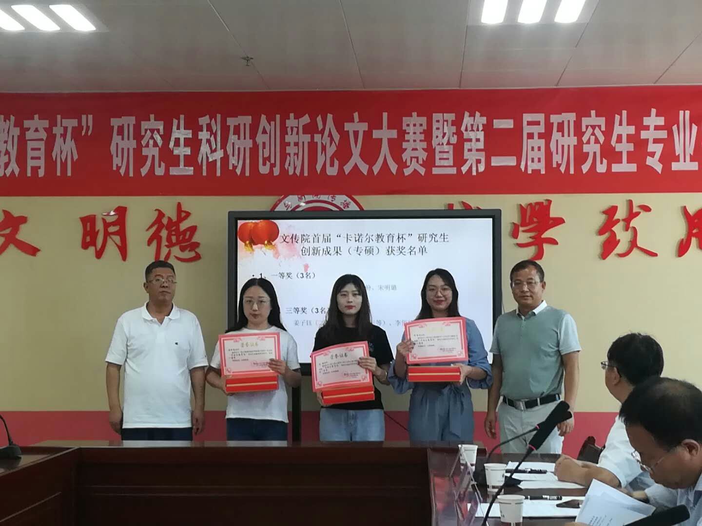 接下来,文传院经理兰拉成、卡诺尔教育集团胥建礼先生为获得一等奖的袁格等三位专硕同学颁奖,文传院副经理孟改正为获得二、三等奖的姜子钰、张竹谨等三位专硕同学颁奖。