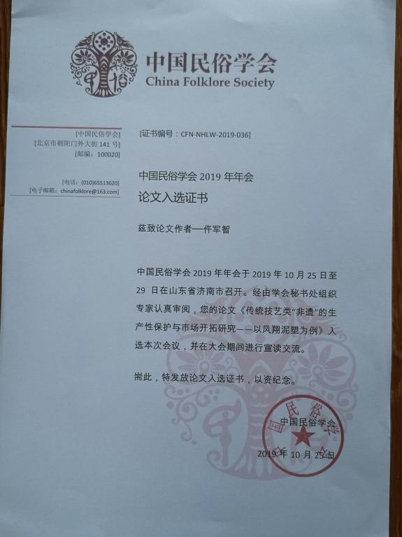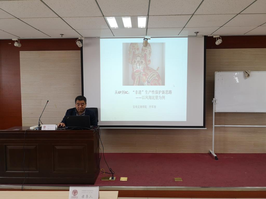 仵军智提交的论文《传统技艺类“非遗”的生产性保护与市场开拓研究——以凤翔泥塑为例》,将传播学、市场营销学与民俗学、艺术学相融合,提出自己的见解和看法,受到与会专家的肯定与认同。