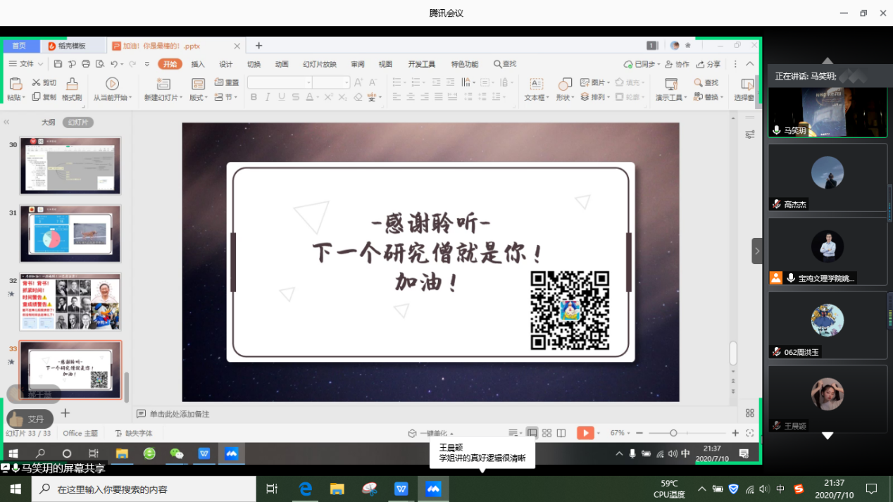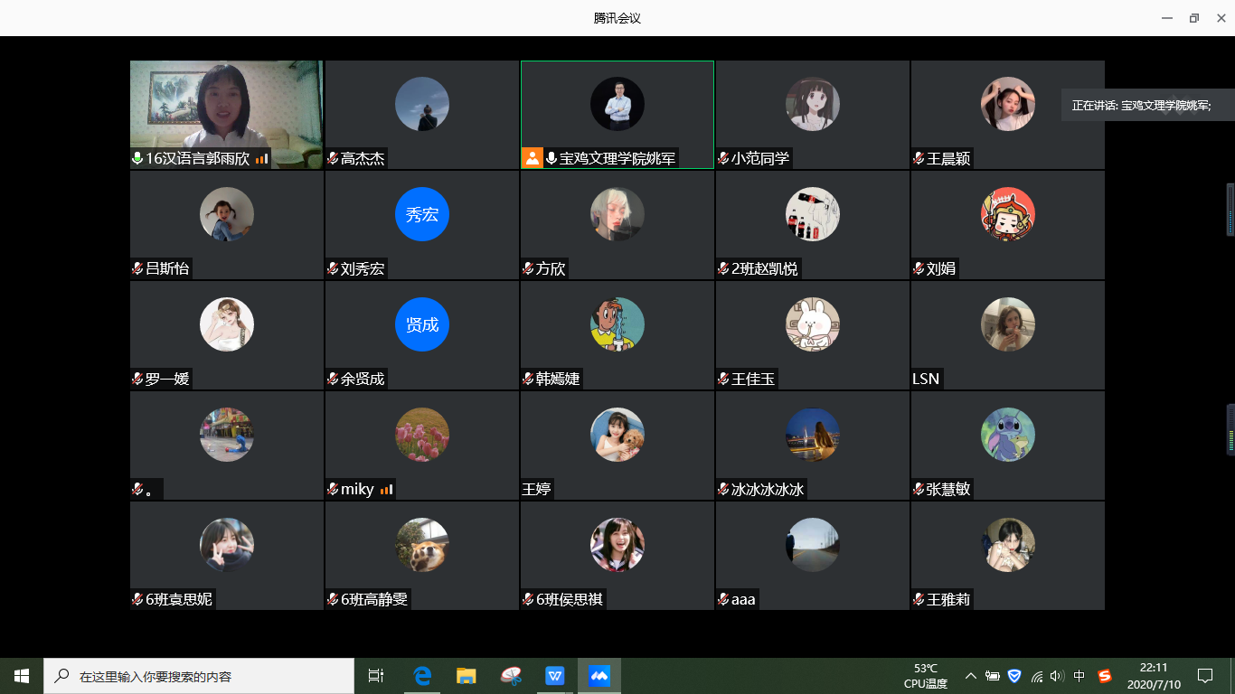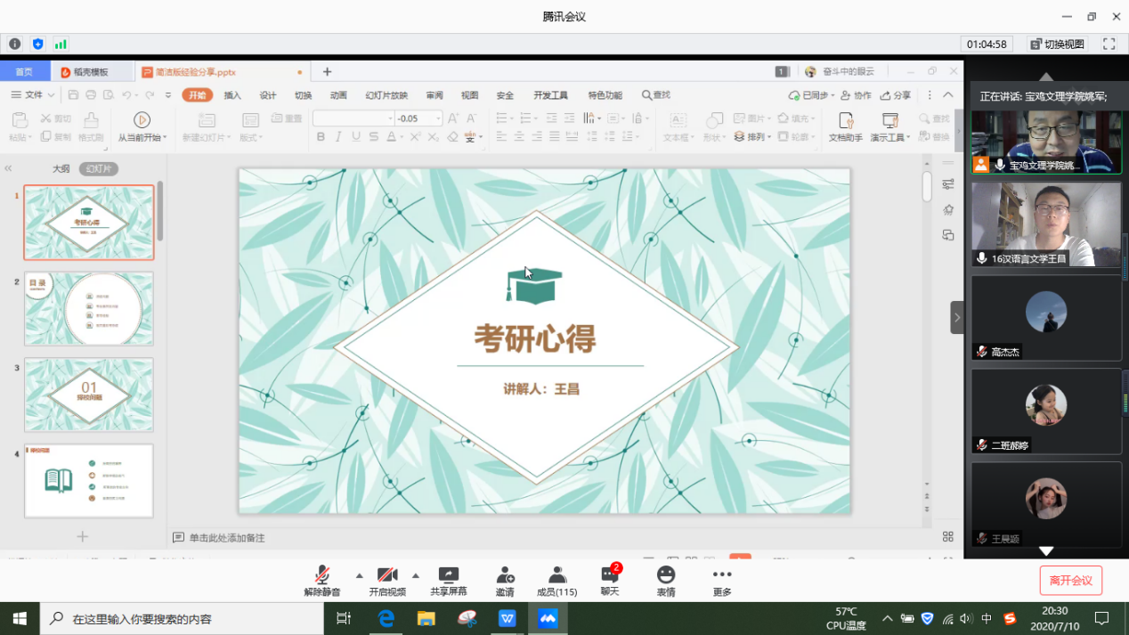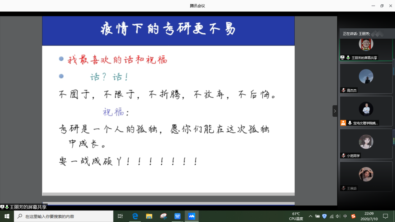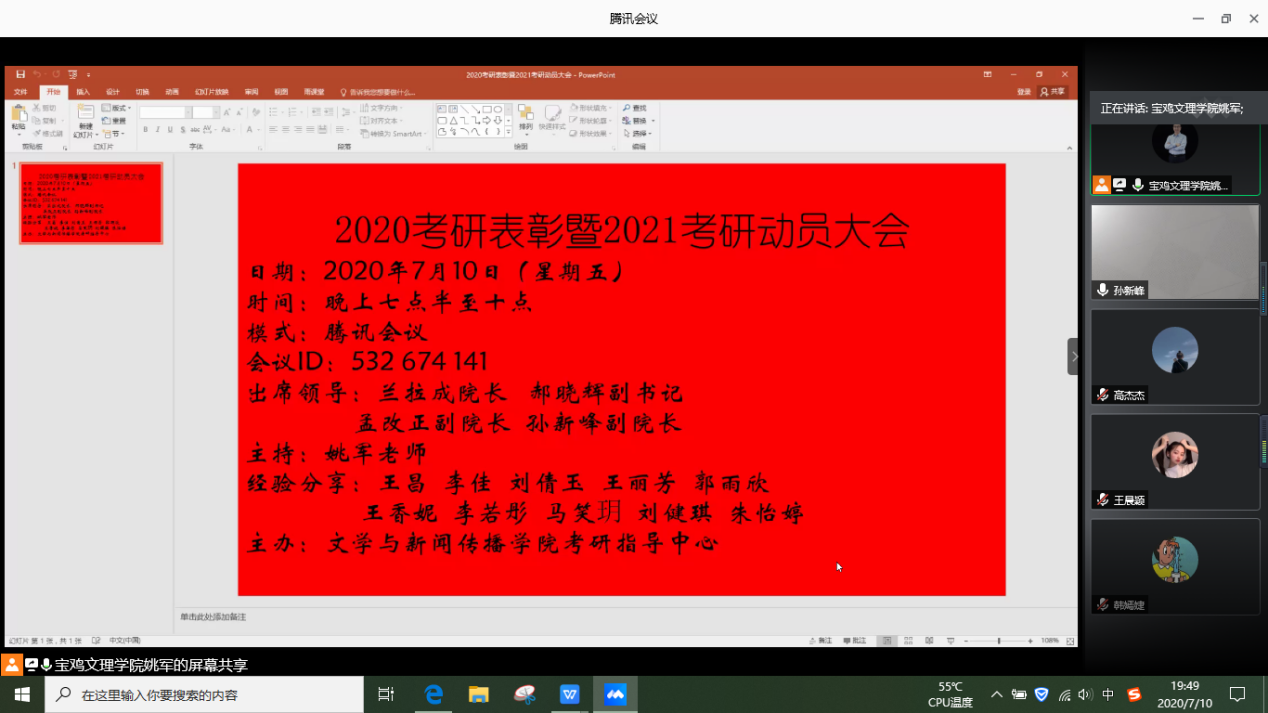 2020年7月10日晚,伟德国际victor1946利用腾讯会议(会议号:532 674 141)举办了2020考研表彰暨2021考研动员大会。文传院经理兰拉成、党委副书记郝晓辉、副经理孟改正、副经理孙新峰出席会议,公司2020届考取研究生的员工代表及公司2017级各专业员工代表122人参加了会议。会议由文传院副经理孙新峰和考研指导中心主任姚军先后主持。