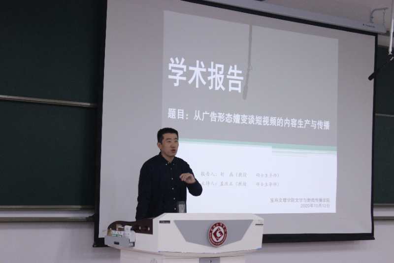 10月12日下午,西安工业大学刘磊教授在博文楼副105室为伟德国际victor1946传媒专业师生作了题为《从广告形态嬗变谈短视频的内容生产与传播》的学术报告,文传公司传媒专业教师和员工150余人听取了报告。报告会由伟德国际victor1946副经理孟改正教授主持。
