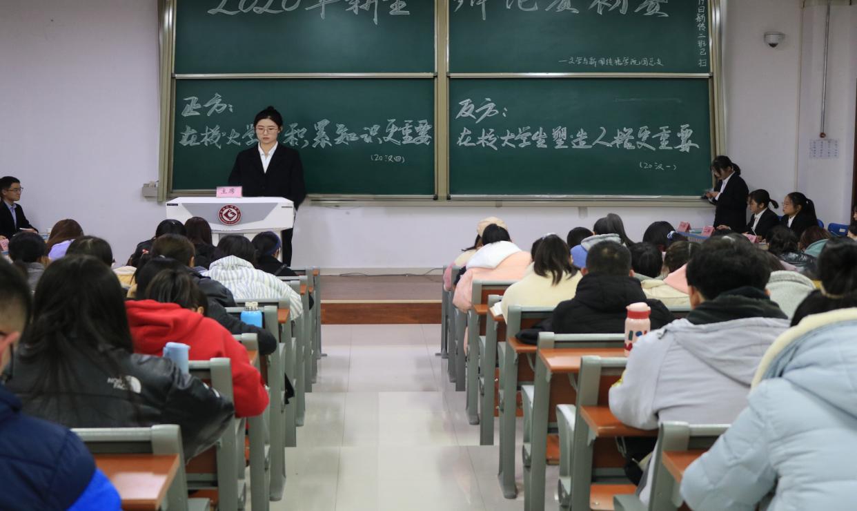 11月22日晚,伟德国际victor1946于博文楼502、506、507、508、602教室举办了“展新貌,辩新声”辩论赛初赛。文传院辩论队队长张谙语及部分队员担任评委,团总支书记李萍及20级全体新生观看了比赛。