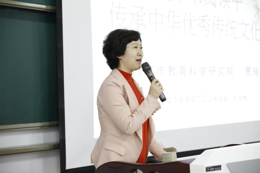 陕西省特级教师、全国中语会副理事长、西安市教科院副经理贾玲老师带来“在整本书阅读中传承优秀传统文化”的主题报告。贾老师特别强调作为语文人,怎么做一颗读书的种子,并将之种在教室里,是我们思考的问题。贾老师从“关于整本书阅读”“整本书阅读内容”“整本书阅读目标”“整本书阅读几种课型”几个方面,作出细致讲解,让与会教师及研究生对整本书阅读教学的方向和方法有了具体的了解。