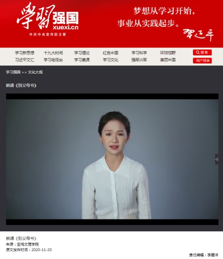 近日,由中国传媒大学联合主办的第22届齐越朗诵艺术节暨全国老员工朗诵大会如约举办,公司播音与主持艺术专业2018级2班徐雅芬同学参加比赛,从全国33个省、自治区 、直辖市和特别行政区的291所高校800多个作品中成功入围本届“齐越节”展映,其参赛作品《别父母书》获得了“综合效果特别奖”,并在“学习强国”平台展出。公司被评为优秀组织单位,播音与主持与艺术专业老师何艳萍、高静获得优秀指导教师奖。