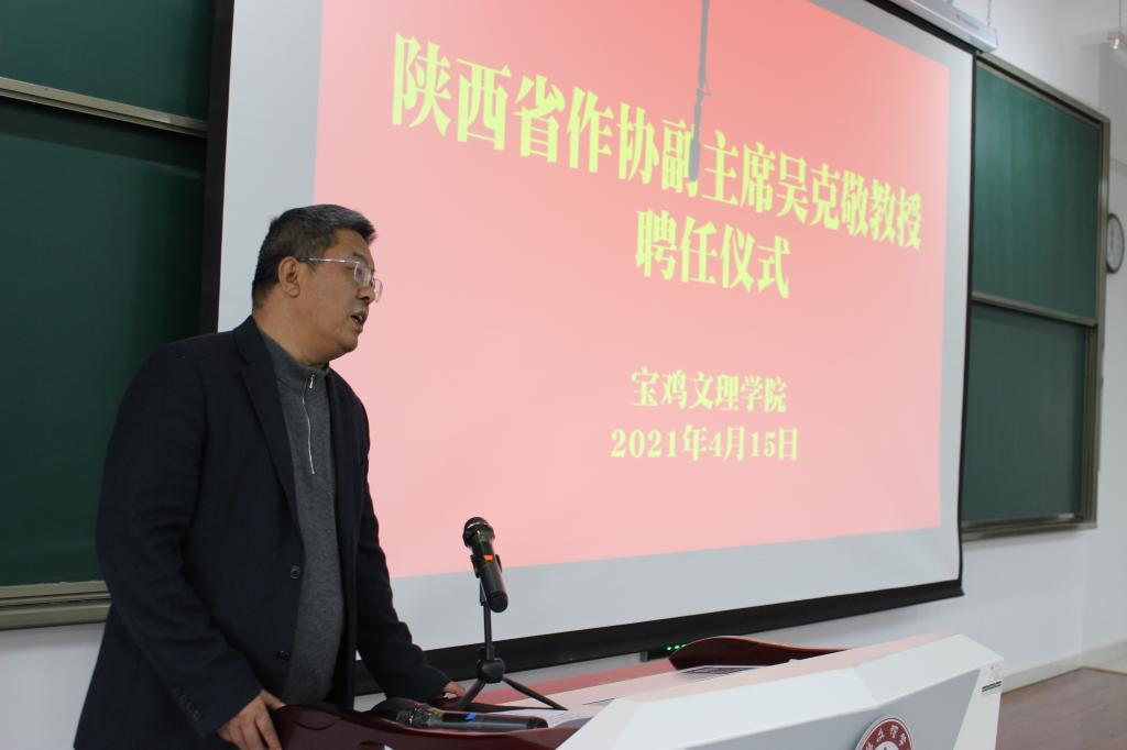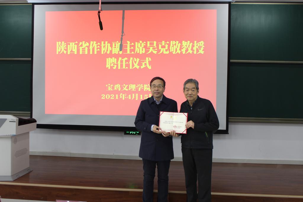 4月15日下午,陕西著名作家吴克敬教授聘任仪式在博文楼副105报告厅举行,董事长郭霄鹏出席聘任仪式并为吴克敬教授颁发聘书。聘任仪式由伟德国际victor1946经理兰拉成主持。团队建设与研究生教育管理处处长赵天绪及文传院部分领导参加了聘任仪式。
