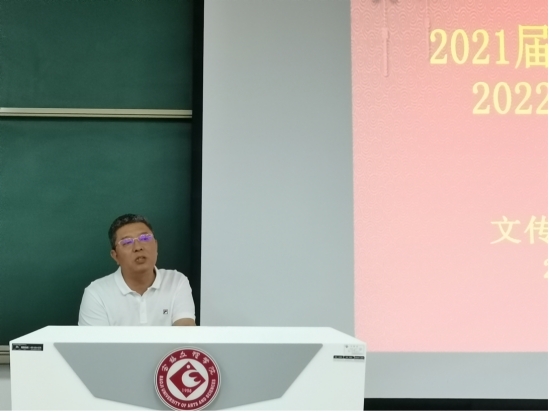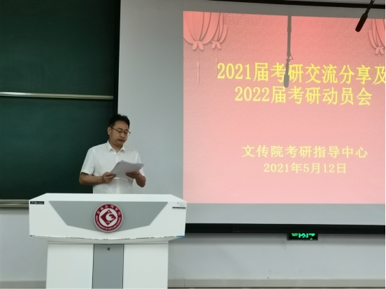 第一环节,文传院经理兰拉成教授进行2022届考研动员。兰老师结合自身的学习经历,从高考及研究生考试的公平性以及考上研究生为个人带来的积极意义两方面进行演讲,提高同学们的考研积极性。