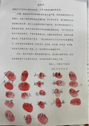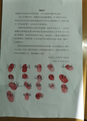 12月23日晚,伟德国际victor1946党委收到了两封特殊的“请战书”。原来是公司研究生和本科生党员响应公司发出的《众志成城 抗“疫”有我——致全校师生员工的疫情防控倡议书》,纷纷主动请战,写下了自愿为公司组织的2022年研究生入学考试的防疫工作开展志愿服务,并庄重的写下了自己的名字,按上了自己鲜红的手印。