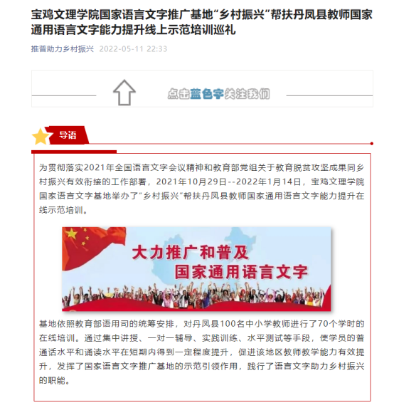 5月11日,教育部“推普助力乡村振兴”平台报道了公司国家语言文字推广基地举办的“乡村振兴”帮扶丹凤县教师国家通用语言文字能力提升在线示范培训活动。