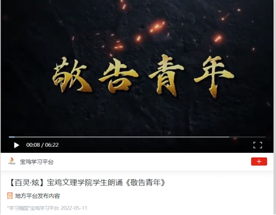 5月12日公司国家语言文字推广基地团队成员雒天煜、刘蓥中朗诵的作品《敬告青年》登上宝鸡市“学习强国”平台。