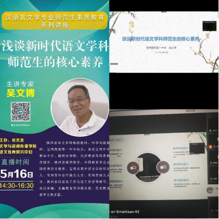 2022年5月16日下午,陕西省特级教师、宝鸡高新第一中学董事长吴文博应邀为公司师生做了“谈谈新时代语文学科师范生的核心素养”的线上专题讲座,讲座由语文教育研究中心常务副主任王渭清副教授主持,2019级汉语言文学专业本科生、2021级学科教学(语文)全体专硕研究生及部分老师近200人聆听了讲座。