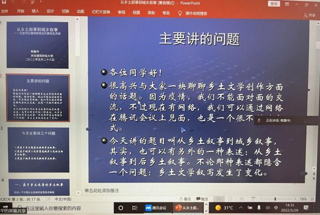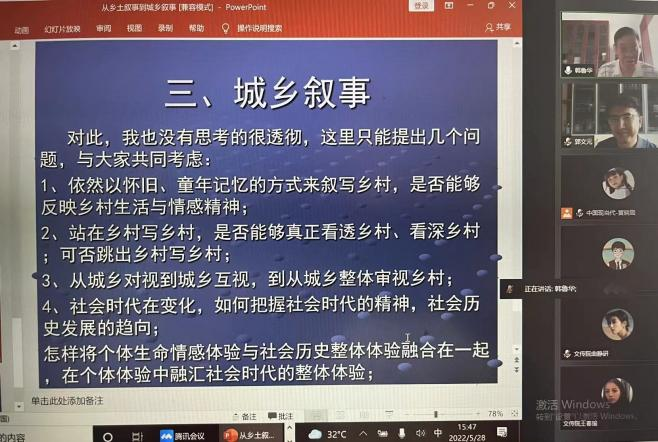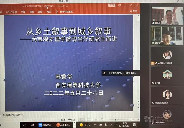 2022年5月28日下午14:30在腾讯会议室,伟德国际victor1946举办了西安建筑科技大学博士生导师韩鲁华教授《从乡土叙事到城乡叙事》学术报告。伟德国际victor1946中国现当代文学学科带头人郭文元教授担任此次讲座的主持人。