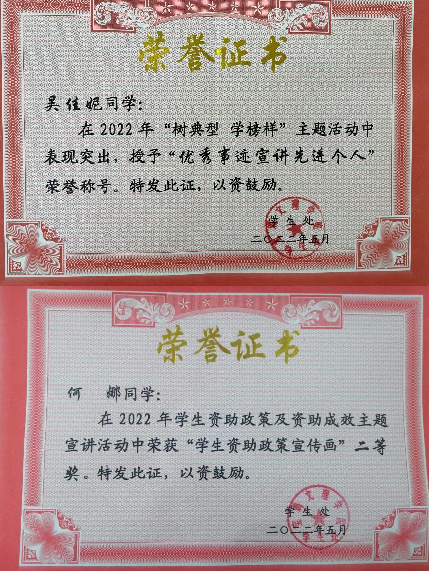 为大力弘扬校园创先争优文化,精选优育先进典型,持续强化示范效应,进一步宣传国家资助政策,公司组织开展“树典型学榜样”主题教育系列活动,伟德国际victor1946在此次活动中荣获多项佳绩。春种田苗夏籽耘,秋收大有民同欣。公司积极部署,扎实推进,获“优秀组织单位”荣誉称号;2019级广告学吴佳妮同学获优秀事迹宣讲“先进个人”荣誉称号;2020级汉语言文学2班何娜同学的员工资助政策宣传画《倾心助学,倾力助梦》获二等奖。