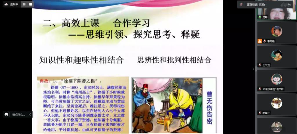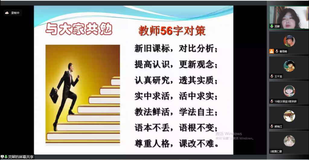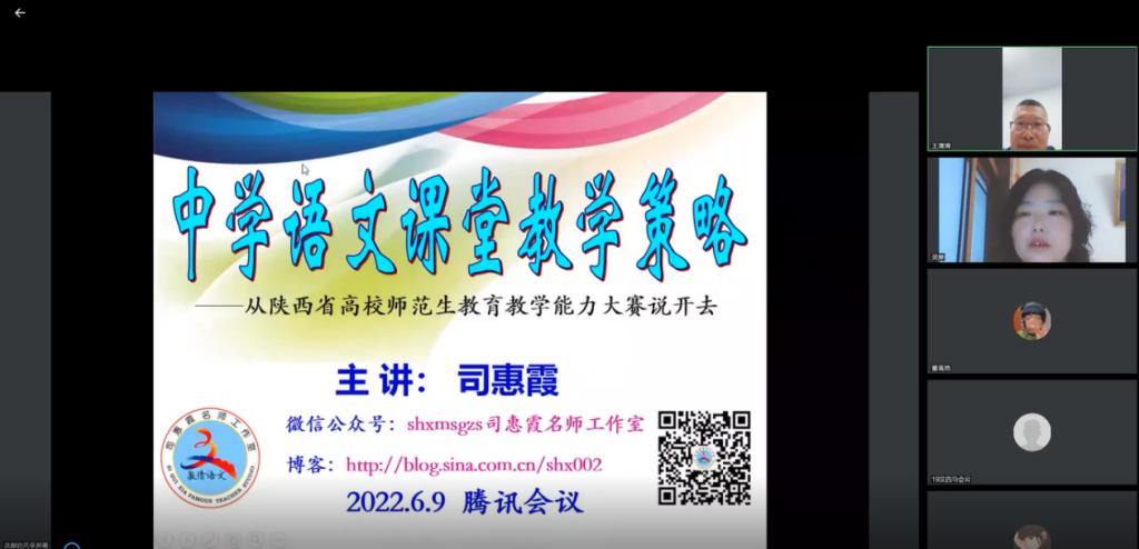 6月9日晚,公司优秀员工、陕西省中小学教学名师、特级教师、公司语文学科教育硕士校外导师司惠霞老师在腾讯会议上作了题为“中学语文课堂教学策略”的学术报告。这场报告也是文传院主办、语文教育研究中心承办的“汉语言文学专业师范生素质教育”系列讲座第五场。公司2019级汉语言文学专业本科生,以及2021级学科教学(语文)专硕研究生近200人聆听了报告。