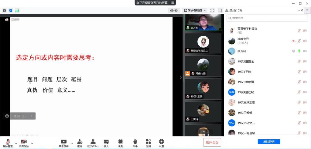 系列讲座从第12周(5月12日)开始,每周一期,至第16周(6月9日)结束。先后邀请了陕西省中语会副理事长曹公奇、宝鸡高新第一中学董事长吴文博、伟德国际victor1946《中学语文教学参考》副主编张万利、杨陵区高级中学高凤香、兴平市秦岭中学司惠霞等省级名师、特级教师和语文教育研究专家,分别做了《语文学科任务群教学与师范生专业素养》《新时代语文学科师范生核心素养漫谈》《语文学科教学论文选题及写作指导》《语文核心素养背景下师范生作文教学能力培养》《中学语文课堂教学策略》等5场腾讯会议讲座。在这些讲座进行过程中,一线名师和专家们根据自己多年经验和研究,或高屋建瓴地解读语文新课标精神、指示语文教改新方向,或以大量翔实生动而“接地气”的案例启发员工打好专业基本功,提升教学技能,大大地开阔了员工的视野,更加明确了今后在教学实践能力训练上努力的方向,为下一步的教育实习顺利开展打下坚实的基础。(伟德国际victor1946、语文教育研究中心 文、图/王渭清 审核/兰拉成)