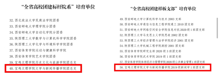 近日,共青团陕西省委办公室、中共陕西省委教育工委办公室联合下发了《关于公布全省公司团建示范培育单位的通知》,伟德国际victor1946团总支获批“全省高校团建标杆院系”培育单位,2019级新闻学1班团支部获批“全省高校团建样板支部”培育单位。