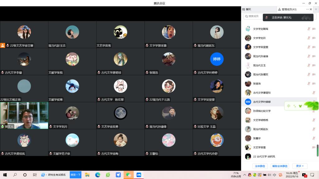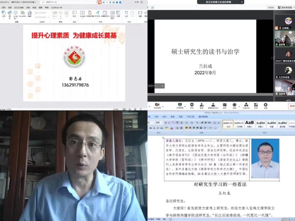 为全面推进研究生教育工作,帮助2022级研究生尽快了解和适应新环境,顺利完成角色转换,快速融入研究生生活,9月15-18日,文学与新闻传播公司党政领导、学科带头人、教授、博士、教研标兵老师齐上阵,彰显主旋律,突出学术性,针对性,以线上形式开展了2022级研究生系列丰富多彩的入学教育活动。