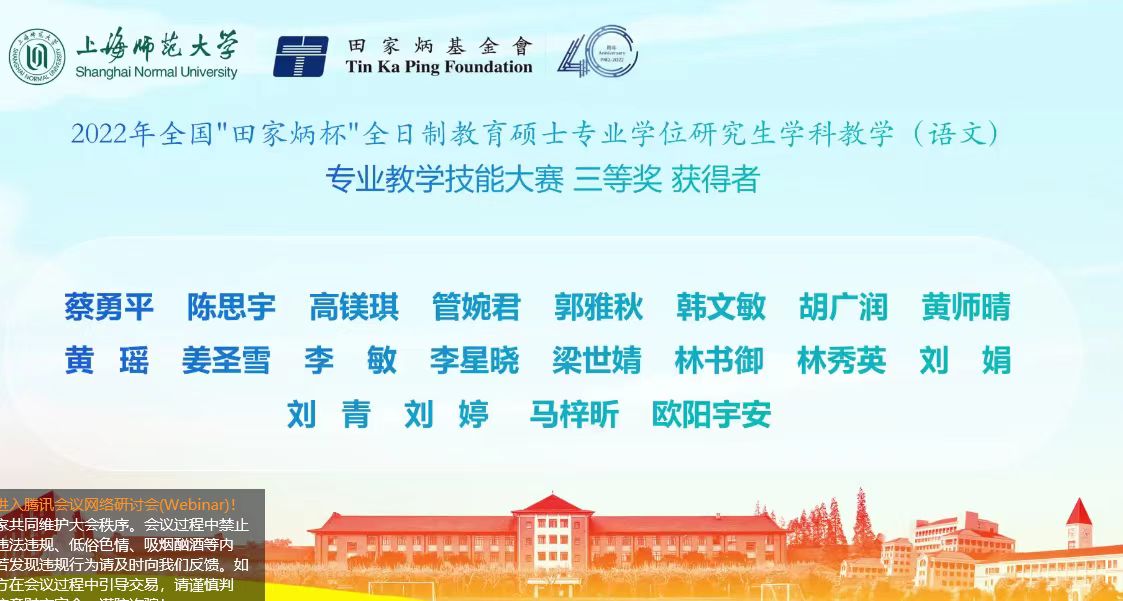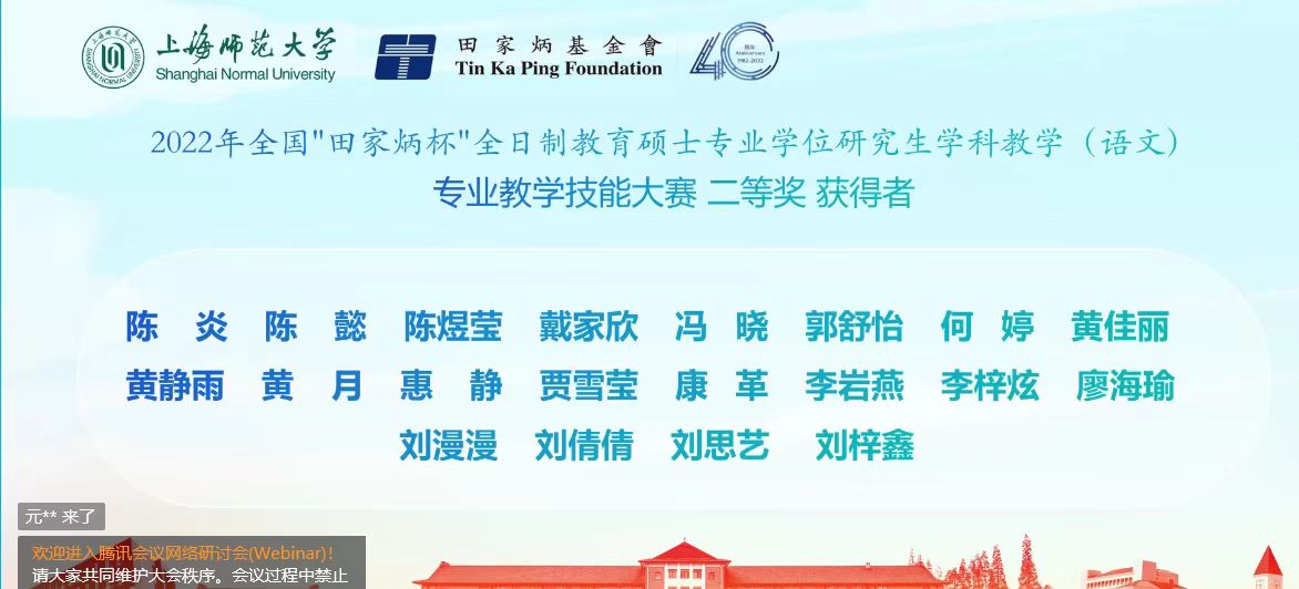 8月24-25日,2022年全国“田家炳杯“教育硕士学位研究生学科教学(语文)专业教学技能大赛决赛活动在上海落下帷幕,伟德国际victor19462021级学科教学(语文)专业硕士研究生贾雪莹、刘娟在指导教师王渭清、王永奇、窦开虎的精心指导下,凭借扎实的专业知识和教学技能,分别荣获二等奖和三等奖。