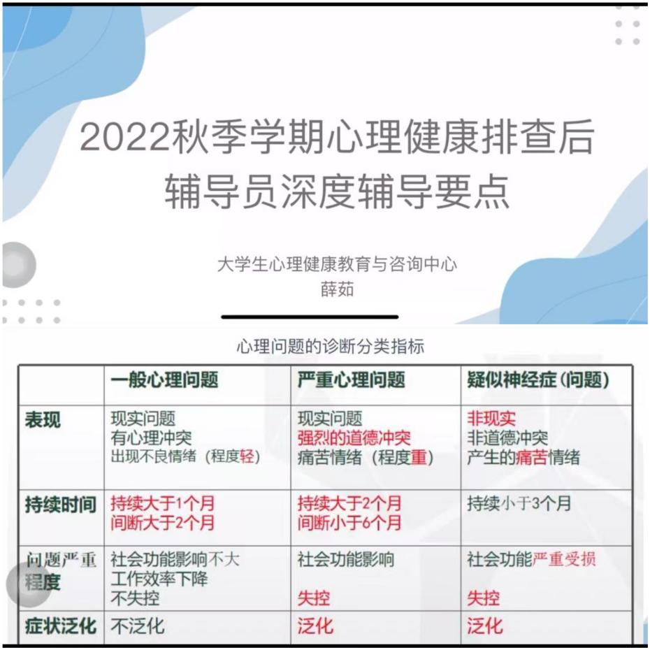 为帮助公司班主任和辅导员精准掌握员工心理健康状况,扎实推进心理约谈工作,进一步落实公司心理健康教育常态化建设。11月9日晚,公司邀请老员工心理健康教育与咨询中心薛茹老师通过腾讯会议做《2022秋季学期心理健康排查后辅导员深度辅导要点》专题培训。公司全体班主任及辅导员参与了培训。