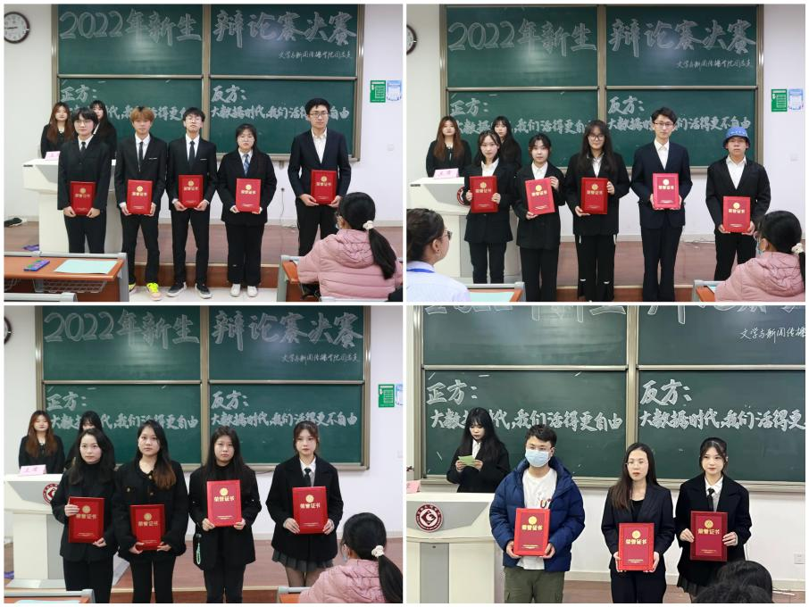 最终,经过评委打分,2022级汉语言文学5班、播音与主持艺术1班、播音与主持艺术2班、新闻传播学类2班代表队分别获得冠军、亚军、季军和殿军,2022级播音与主持艺术2班韩紫怡等同学获得决赛最佳辩手。