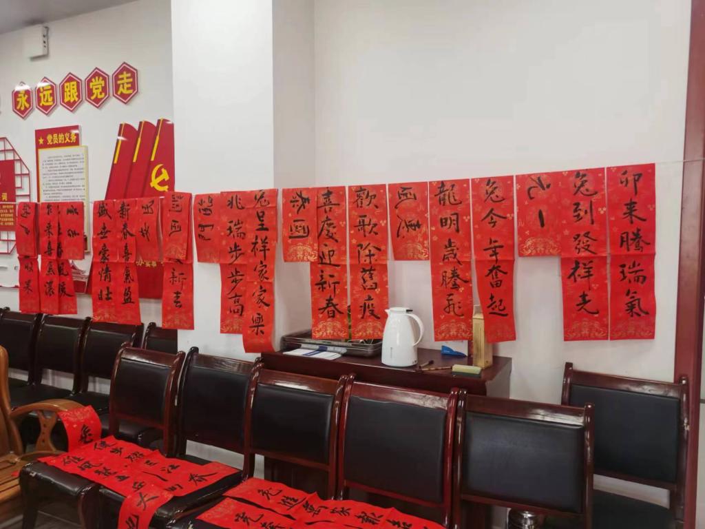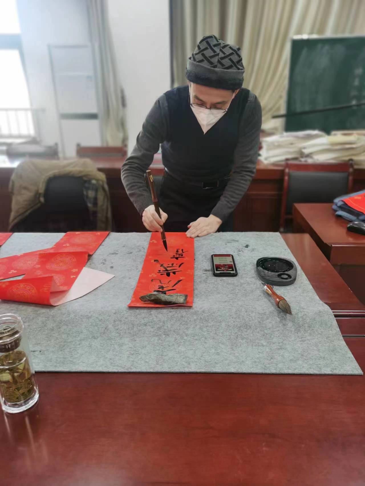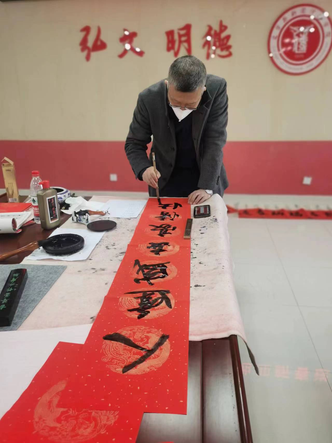 活动现场,王渭清、李剑清、赵保胜等老师浓墨化字,斗大的“福”字铺满桌面,一幅幅泛着墨香的春联与“迎春纳福”的主题标语营造出喜庆的节日气氛和韵味浓厚的校园文化氛围。
