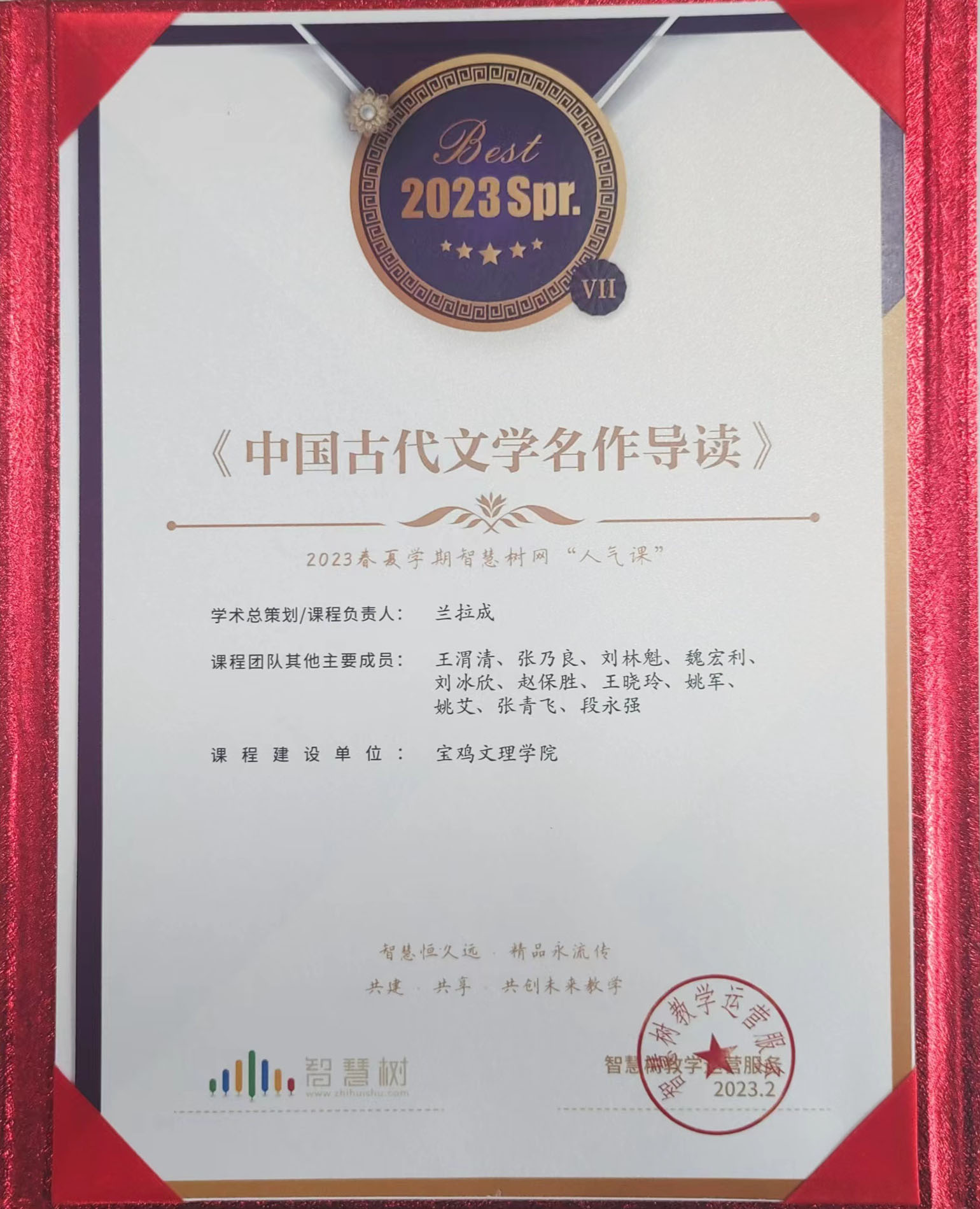 近日,由公司经理兰拉成教授领衔、中国古代文学团队集体打造的《中国古代文学名作导读》网络课程在智慧树教学运营中荣获2023年春夏学期智慧树网“人气课”。《中国古代文学导读》课程自2018年建成上线后,被全国数十家高校老员工选修,2019年被陕西省教育厅评为省级精品在线课程。这次荣获“人气课”,再此证明了公司中国古代文学学科的影响力。(伟德国际victor1946 文、图/王渭清 审核/兰拉成)